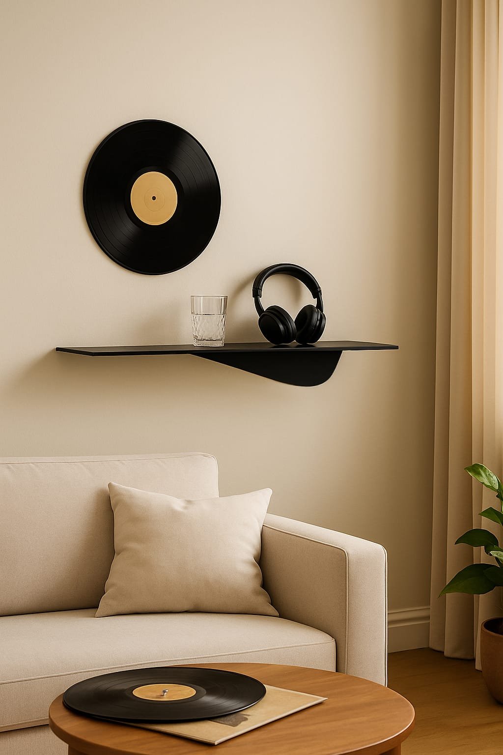 Estante minimalista de hierro cortado a láser. Mide 70 cm de largo y 13,5 cm de profundidad. Ideal para vinilos, accesorios y elementos de estudio. Resistente, limpio y muy estético. Soporta hasta 20 kg.